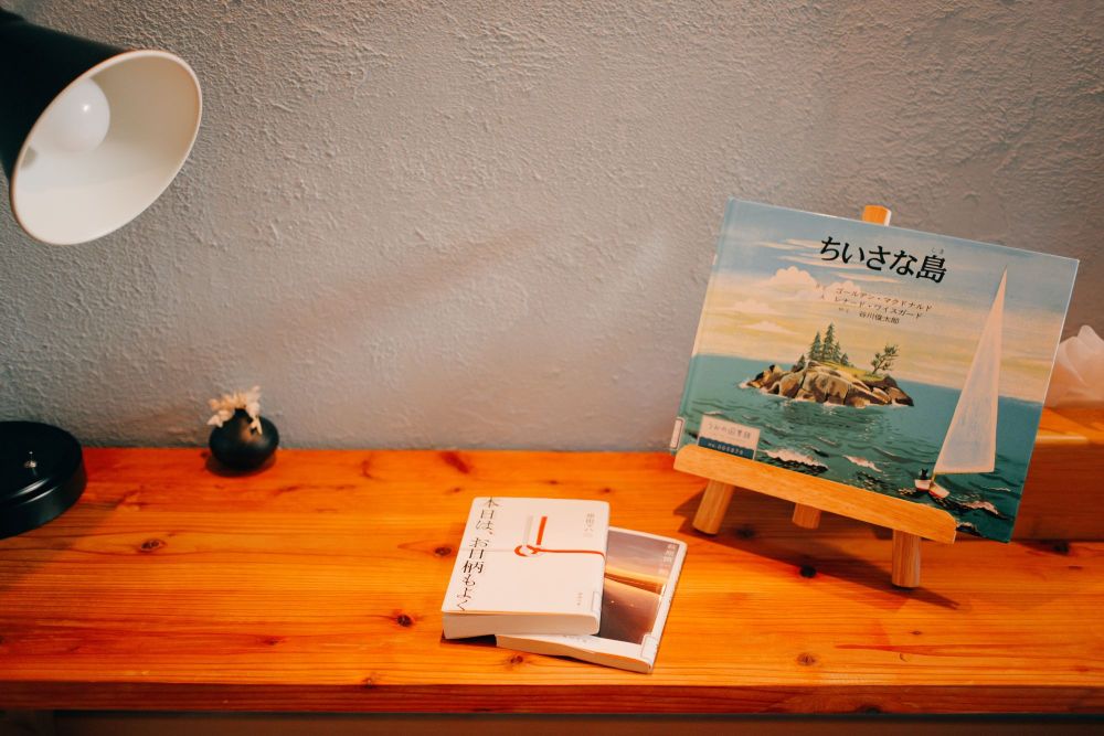 あとは、チェックインの時にお声がけいただいたのが、事前にヒアリングしていた内容に沿った本を泊まる部屋に置いておきました、という話!!すんごいときめきでしたこれ。選んでいただいたのは、原田マハさんの「本日は、お日柄もよく」と、萩原慎一郎さんの歌集「滑走路」、それから、ゴールデン・マクドナルド作、谷川俊太郎訳の「ちいさな島」でした。その日は本当に天気が良く、確かにお日柄がいい日でした。そして、事前のアンケートには、最近短歌に興味があります、と答えたので、歌集と谷川俊太郎さんが関わった本は納得のチョイスでした。